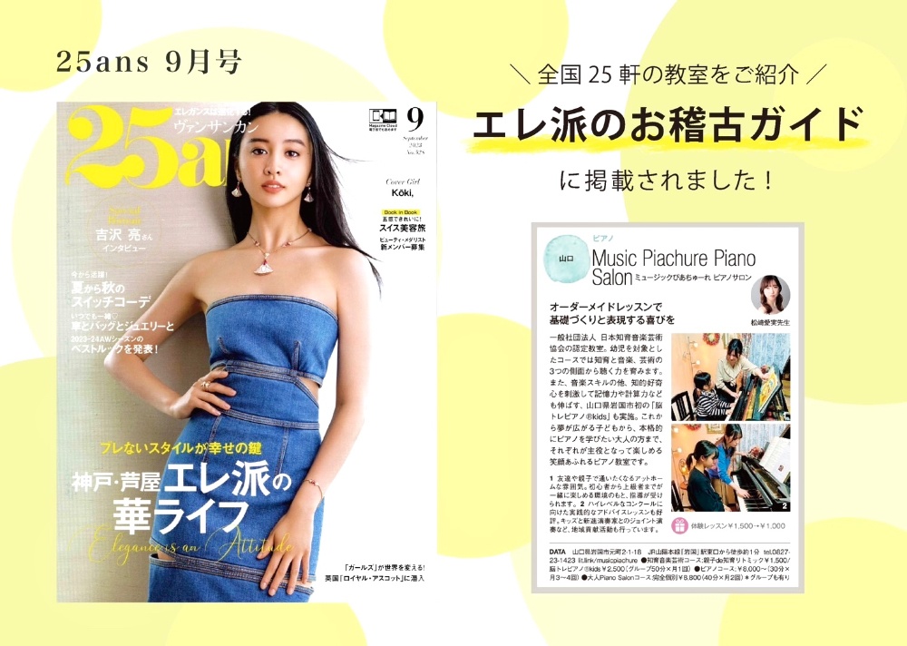 | レッスン室 (使用楽器) | ♦︎ミュージックぴあちゅーれPiano Salon →岩国市元町 (ディアパソングランド他) ♦︎ミュージックぴあちゅーれPIANO中津レッスン →岩国市中津町 (カワイグランド他) ♦︎ミュージックぴあちゅーれ さくら <4月開講> →保育施設音楽室 (ヤマハアップライト他) |