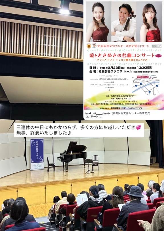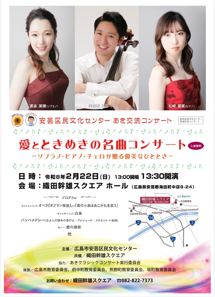 🎼あき交流コンサート2月22日(日) 13:30開演愛とときめきの名曲コンサート入場無料<会場>織田幹雄スクエアホール
